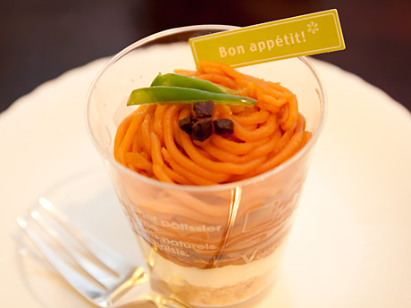 たまねぎ味のビスケットの上にクリームチーズ、ケチャップ餡の上にカリカリベーコンと本物のピーマン。一度に口にいれると確かにナポリタンが口の中で完成する不思議なケーキです。